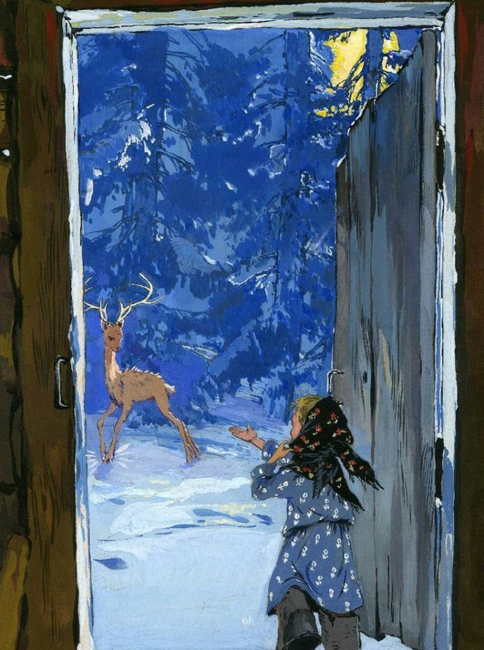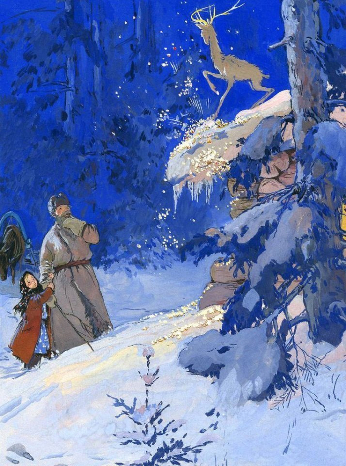 1. Начнём, пожалуй, с "Серебряного копытца". В оригинале сказа Бажова этот персонаж - эдакий аналог Золотой Антилопы, только вместо золотых монет из его копыта выпадают драгоценные камни - хризолиты. Если в сказе он описан как «козёл с множеством веточек на голове», которые остаются у него, тогда как другие животные рога зимой скидывают, то можно предположить, что слово «козёл» в данном контексте подразумевало именно оленя. Хотя, некоторые художники и адаптаторы истории считали Серебряное Копытце самцом косули.