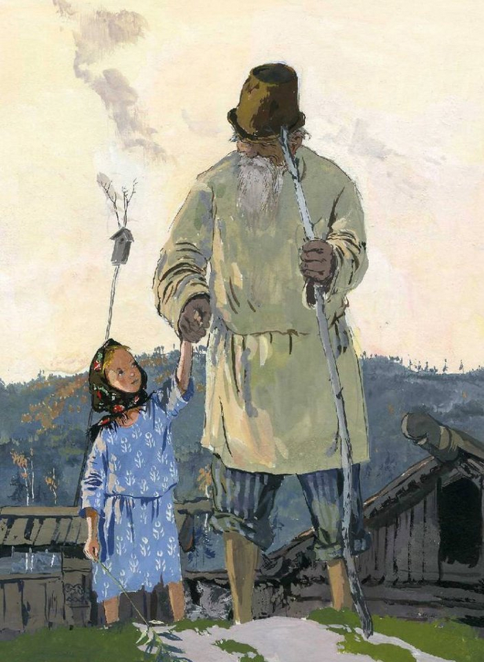 Некоторые из ребят даже нарочно портили поделки, чтобы их в конце концов прогнали. Но с появлением Данилы многое изменилось. Прежде суровый, Прокопьич постепенно сблизился с Данилой, который сразу же в первый день их знакомства указал на недостатки малахитного изделия - не на той стороне наставник начал кромку отбивать. Как и Данила, Прокопьич жил в полном одиночестве. Жена его давно умерла, а из соседей его навещала Старушка Митрофановна, убиралась в избе и готовила еду.