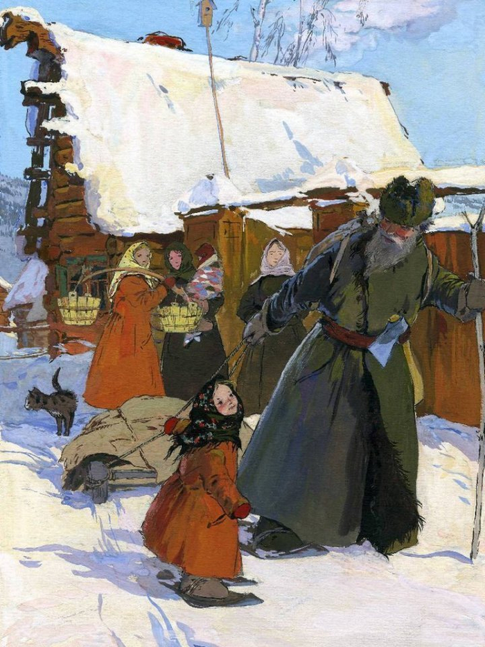 Настасья сразу же смекнула, что что-то тут не так: когда она сама наряжалась в эти уборы, у неё то пальцы затекали, то уши болели, то шея не могла согреться, да и перепрятывала шкатулку подальше от дочурки. Но, как только вся семья уезжала на работу, Танюшка, убравшись в доме, вновь принималась играть с "тятиным подареньем".