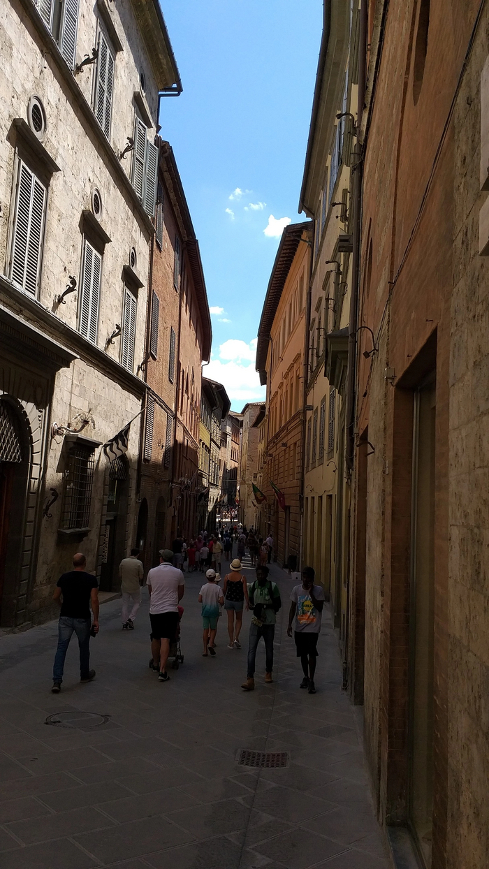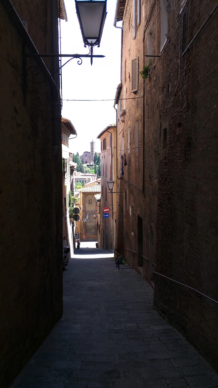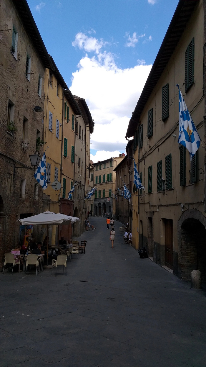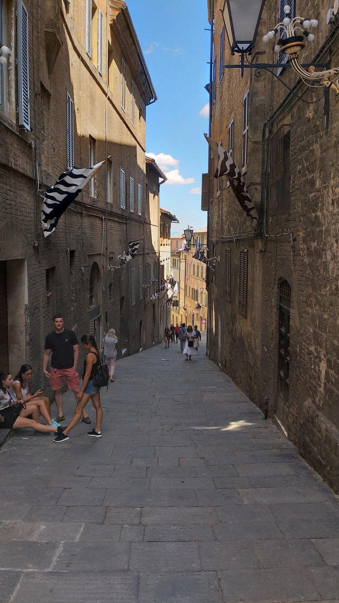 Продвигаясь по узким улицам вдоль высоких домов , создается впечатление, что ты находишься в замке, окружённом крепостными стенами. Я большой фанат истории средневековой Европы и прочитал об этом времени десятки книг и статей , посмотрел сотни исторических роликов и фильмов. Гуляя по сиенским улицам, я буквально телом ощущал дух того времени, визуализировал глазами сражения, которые могли проходить на улицах подобных городов. Просто посмотрите на эту красоту!