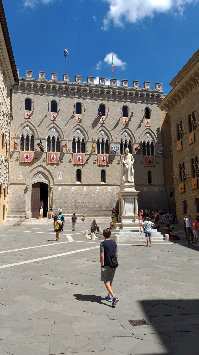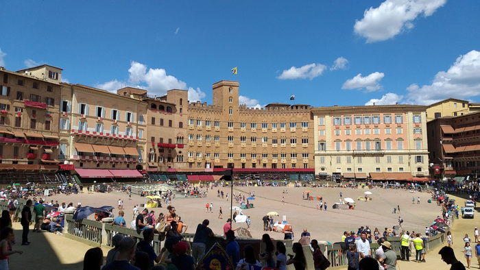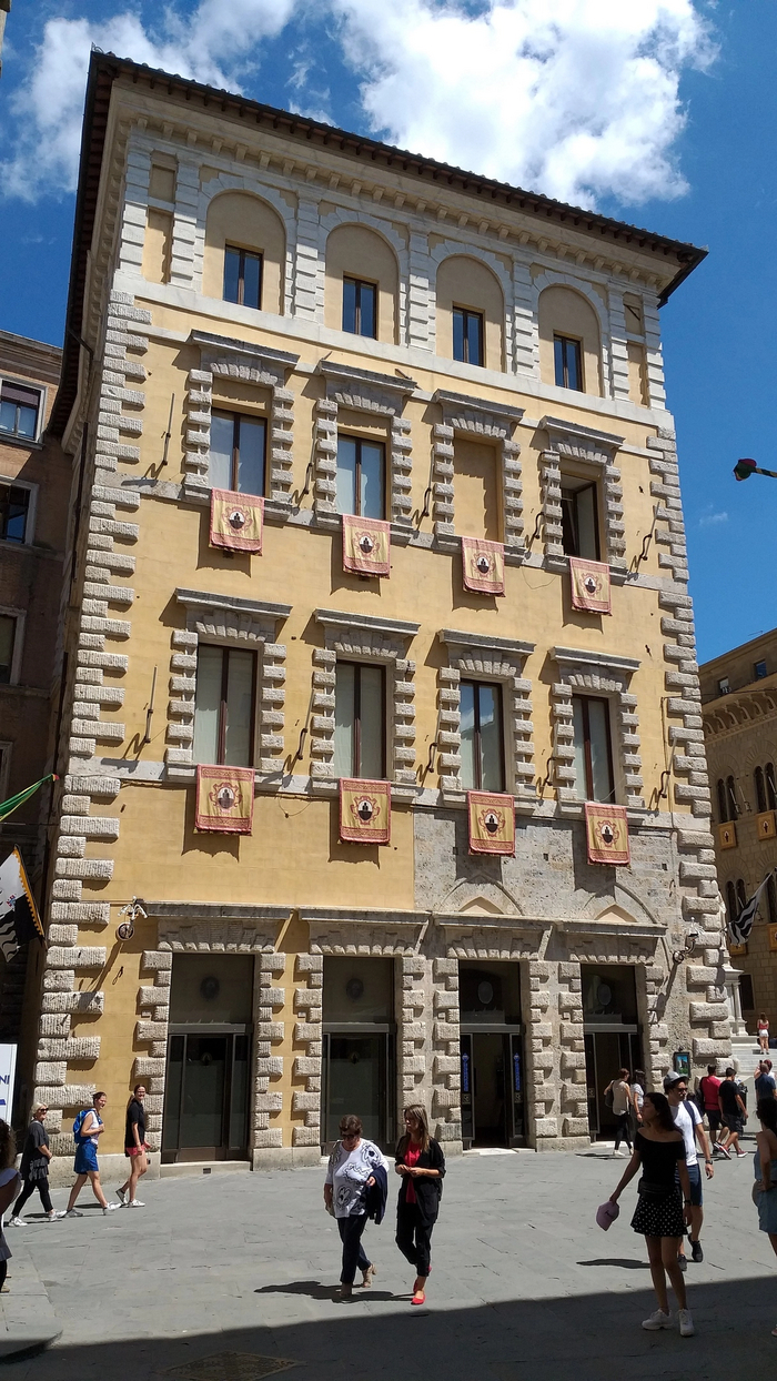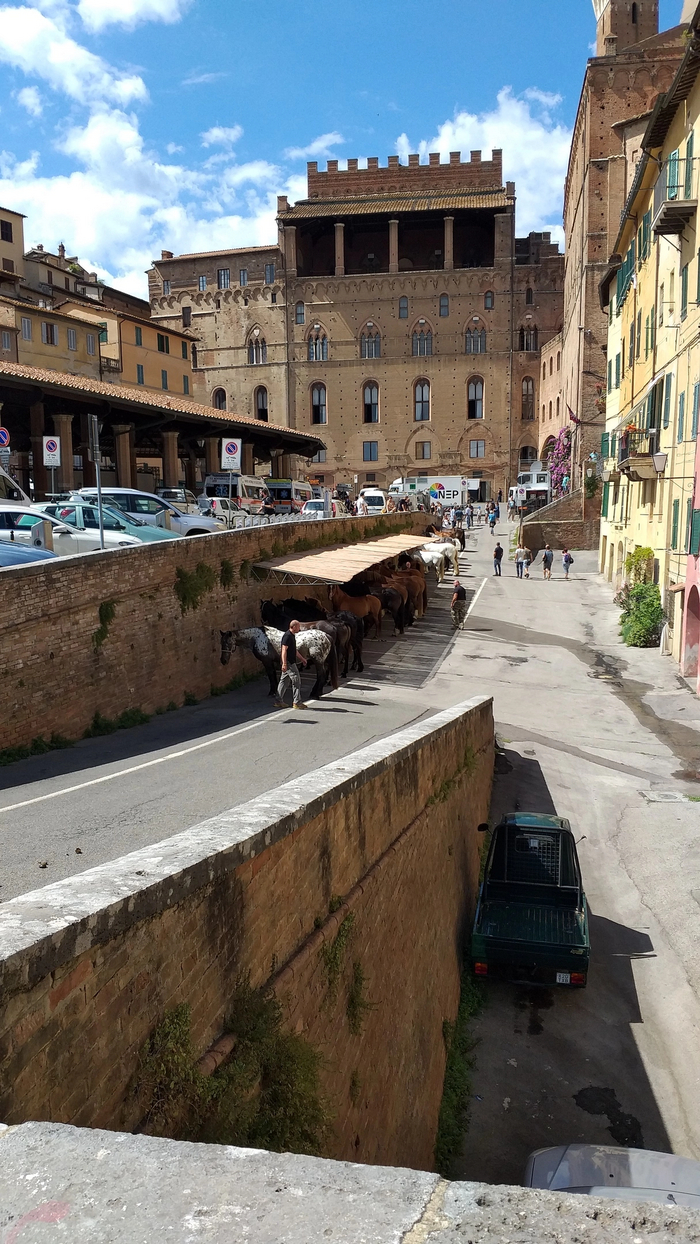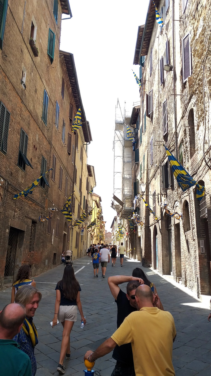 Сиенское Палио—это традиционные скачки , проходящие в Сиене дважды в год: 2 июля и 16 августа. Весь город поделен на 17 контрад(районов) - в состязании 2 июля участвуют 7, не принимавших участия в июльских скачках предыдущего года, плюс три из оставшихся 10, которые определяются жребием, всего же стартуют 10 участников; такой же порядок действует и применительно к августовским скачкам. Каждая контрада имеет свой герб и традиционные цвета, в которые одевается представляющий её всадник. Как раз эти флаги контрад я и видел развешеными на зданиях в разных частях города.