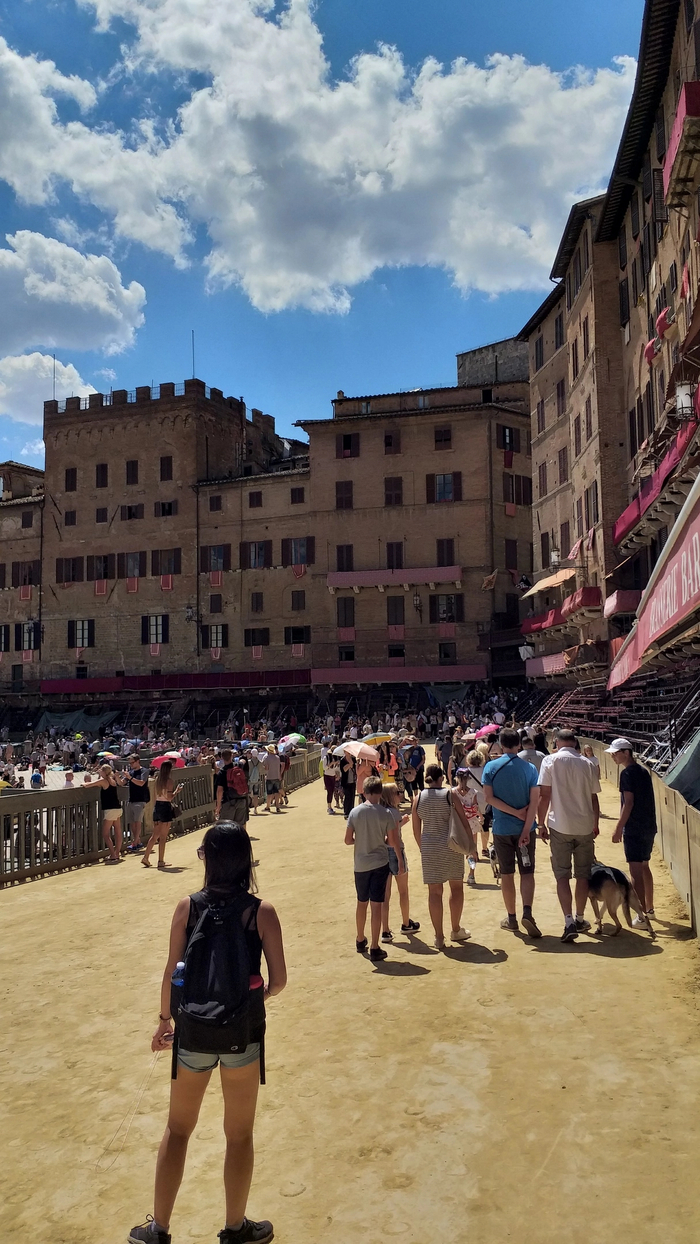 Наслаждаясь архитектурой и все больше пропитываясь духом истории , я вышел на одно из самых красивых мест, которые только видел в жизни - Пьяцца-дель-Кампо, центральную площадь Сиены. Когда ты на нее ступаешь, создается впечатление, что ты попал в Колизей! Дома как трибуны окружают центр площади, образуя круг арены.