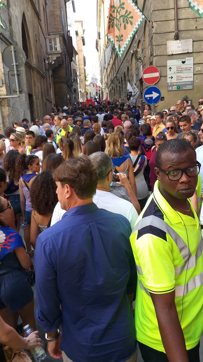 Чем ближе было начало скачек, тем больше народа становилось на узких улицах города. Я приезжал в Сиену на один день и под вечер скрепя сердцем был вынужден продвигаться на вокзал, чтобы успеть на поезд. Попытка выбраться из центра стала тем еще квестом. Находясь в районе Сиенского собора я вбил в навигатор маршрут до вокзала и стал пытаться проследовать по нему, но проблема в том что улицы к этому моменту выглядели так.