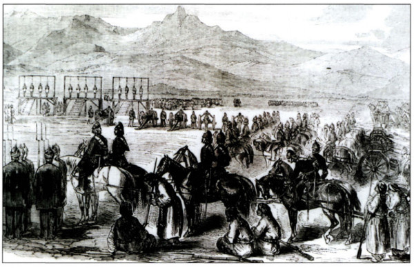 Повешение двух участников индийского восстания сипаев 31-й родной пехоты. Охраняют верные британцам сипаи.