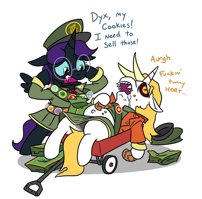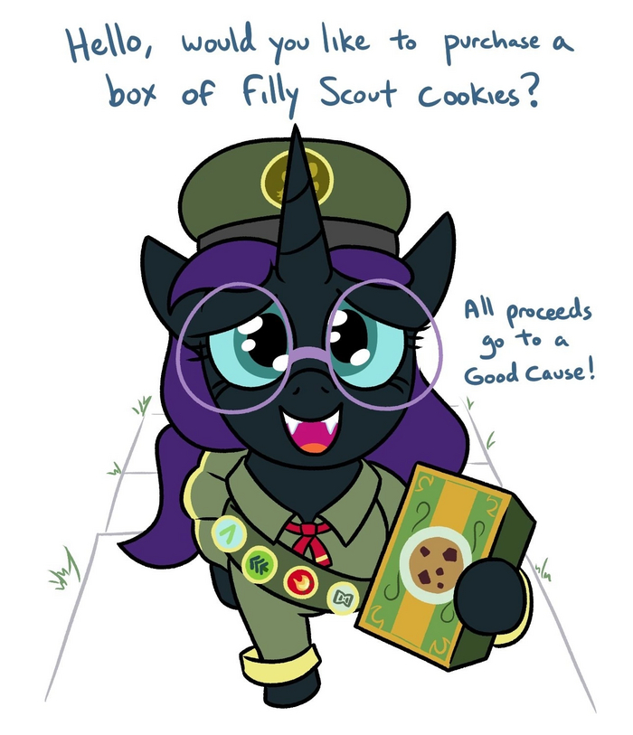 Первая страница. Речь Найтмер: Здравствуйте, вы хотели бы приобрести коробку печенья Filly Scout? Все вырученные средства пойдут на доброе дело!