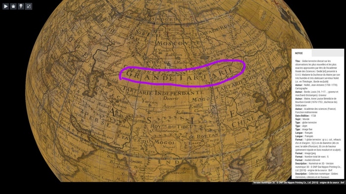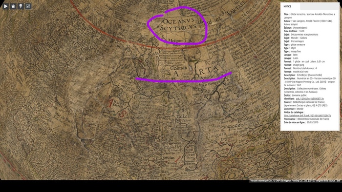 Другими словами, от Каспийского моря до Северного ледовитого океана и до Тихого океана на востоке всю территорию занимали скифы — именно это написано у Страбона. И именно поэтому есть такой глобус 1633 года, где Северный ледовитый океан называется Скифским. На этом же глобусе (и у меня полно таких) присутствует вся «древнегреческая» топонимика. И тут же есть Тартария. (Глобус взят из Французской национальной библиотеки).