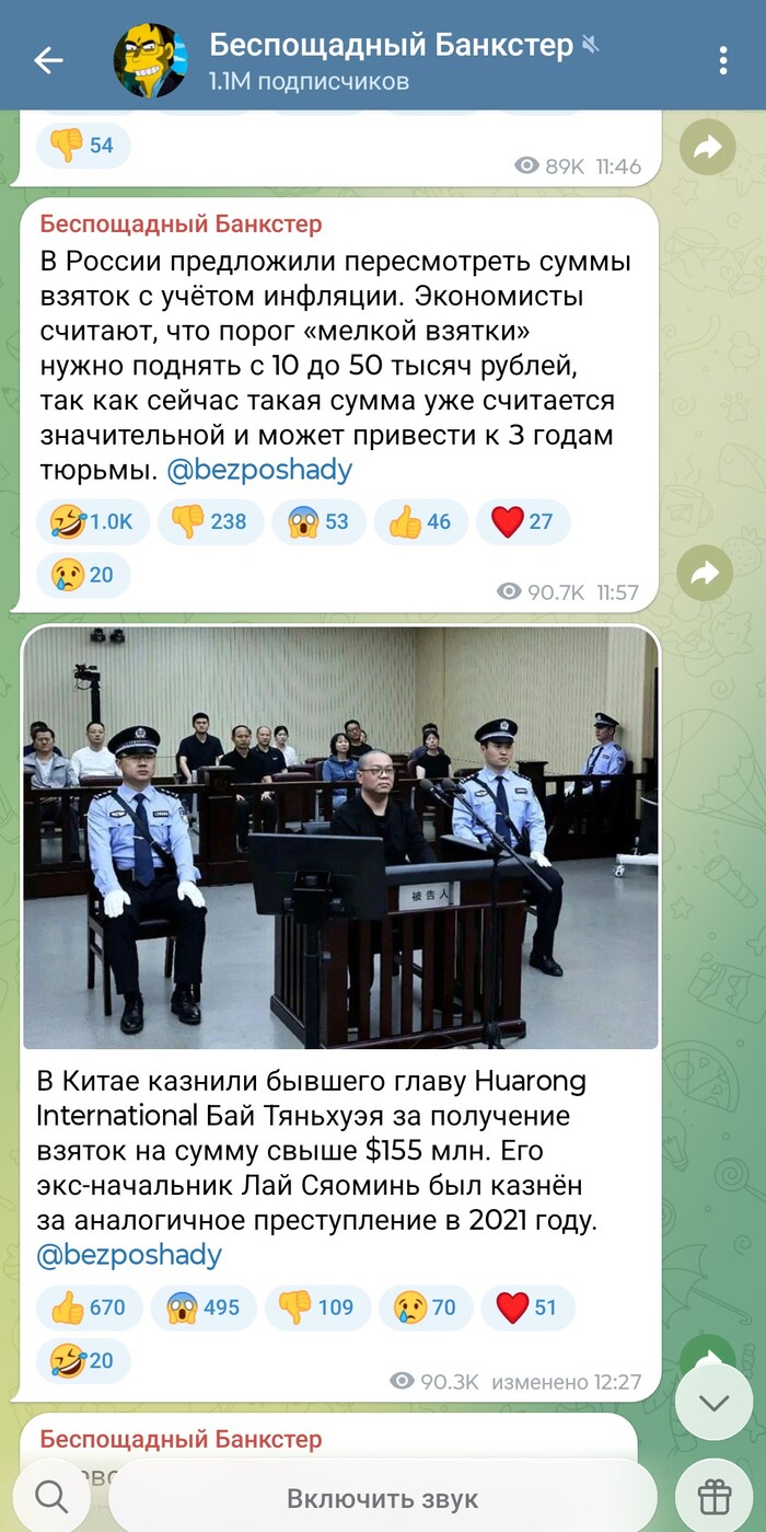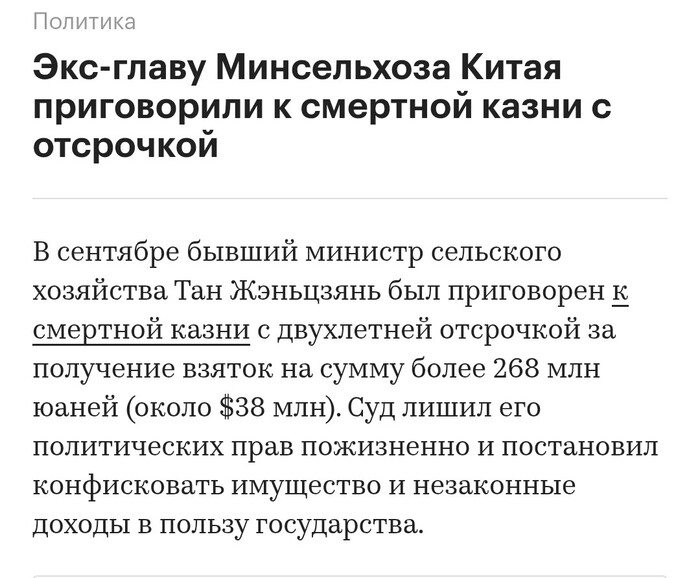 Бывший генеральный директор China Huarong International Holding Бай Тяньхуэй был казнен утром 9 декабря по решению суда. Его признали виновным в получении взяток в особо крупном размере — свыше 1,108 млрд юаней (около $156 млн). Об этом сообщает Центральное телевидение Китая.