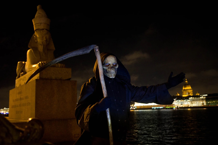 Про фигуру с косой. Тёплый августовский вечер прошлого года. К вечерам уже сумерки, Питер всё таки, белые ночи уже отступили. Замотался по городу, вернулся поздно. И по возвращению домой, собрал мешок с мусором, понёс его к бакам. У нас это тот ещё квест по подворотням. Выхожу из калитки в арке (пока кнопку нажмёшь, пока её на доводчике откроешь)... и краем глаза замечаю шевеление сбоку от меня. Перевожу взгляд, а там на лёгком сквозняке ткань развевается... взгляд поднимаю выше (а "мальчег" я не маленький, два метра роста), а около арки стоит Смерть с косой выше меня на полметра, смотрит на меня и курит... Чёт мне так нехорошо стало, прям вот защемило что-то, и остро захотелось мне продать свою жизнь как можно дороже. Видать то как я замахиваюсь подействовало на моего оппонента, и тонкий (реально, тоненький) голос взмолился: - Только не бейте!... Обосрались все, как говорится. Кто, сцуко, придумал эту ересь водить экскурсии аниматорами в таком костюме, в балахоне и на джамперах - лучи поноса в твою сторону. А чувак под балахоном обмолвился, что наряд опасный. Отпиздить пытаются часто ;)