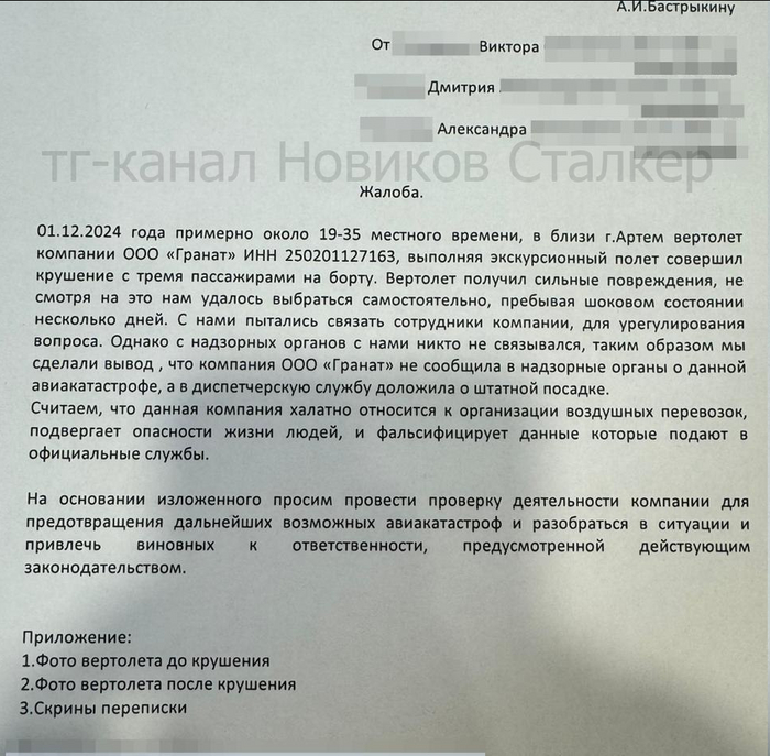 Пассажиры и написали жалобу председателю СК РФ Бастрыкину с просьбой провести проверку компании «Гранат», так как организация не сообщила об инциденте в надзорные органы.