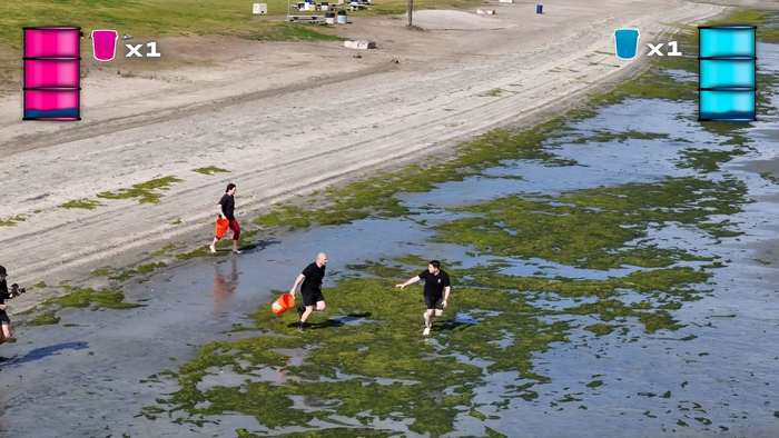 Второе состязание. Наполнить бочку водой зачерпывая её из водоёма. Даётся ведро, почему-то с дырками. Мужики опять побеждают, теперь за счёт более лучшей командной работы. Здесь сложно сказать, просто повезло с выбором более лучшей стратегии передавать ведро? Или дело в том, что их работа просто предполагает лучшее понимание подобных задач и лучшая стратегия сразу была выбрана на основе опыта.