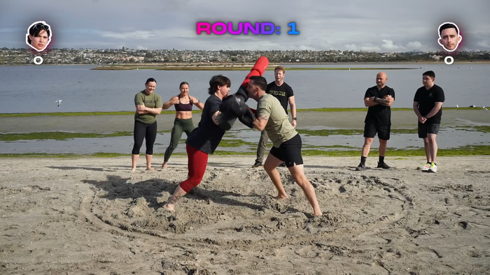 Пятое состязание - перетягивание каната. Здесь мужчины тоже побеждают. По весу команды вроде бы примерно одинаковые. На видео выглядит, что мужчины как-то более норовисто изначально выбрали позы. Последняя, в красных штанах, вообще на каком-то расслабоне стояла, как будто даже не знает что такое перетягивание каната. Опять победил некий опыт?