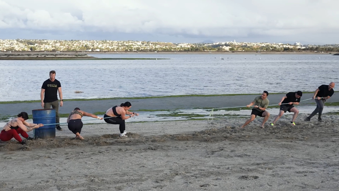 Первое состязание, тащить 45.3кг(100 фунтов) мешок по песку. Мужики уверенно побеждают. Женщины в шоке.