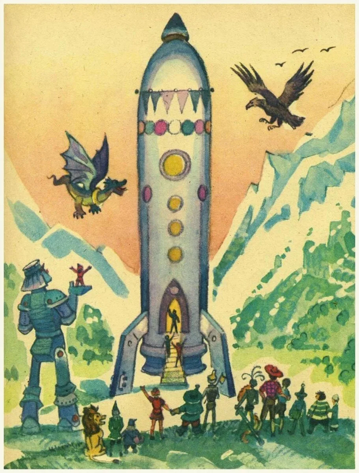 - Всей линии Урфина Джюса. Да-да, все Дни Угощения, все сюжетные ходы с изумрудами, камнем Гингемы, придуманным кладом – это поздние добавления (неясно, Волкова или редактора всё-таки). Потому что…