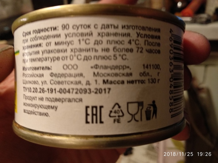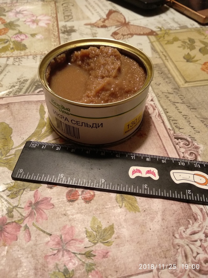 Приобретена в Ашане, 25.11.18 вскрыта в тот же день... Цвет ну мягко говоря - разлагающийся, запах.... уххх.... Дата изготовления 15.10.18. срок годности 90 суток с даты изготовления и тут вершинка на тортике!!! Температура хранения - от -1 градуса до +4... до вскрытия... а уж после аж! 72 часа... Забирал с полок для соленой рыбы, увы не посмотрел на УСЛОВИЯ ХРАНЕНИЯ.... 130 гр за 80 руб... грубо говоря за кг. икры сельди 615 р. Нифига не мало...Цветопередача фото и монитора немного его осветлила... Берегите себя и своё здоровье, не берите именно данный продукт из фирменной линейки продуктов "Каждый день"...