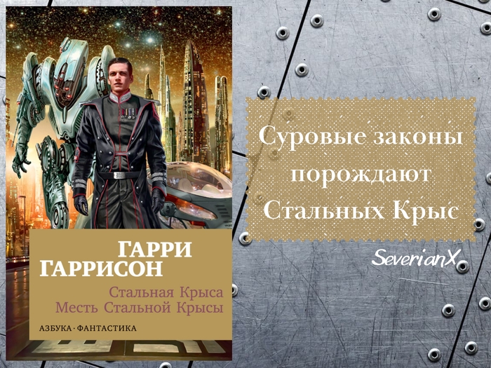 Протагонист-антигерой, ловкий мошенник, противопоставлялся неповоротливой машине государства и своим менее принципиальным собратьям по ремеслу, не обременённым понятиями чести. Таким образом, образ удачливого преступника романтизировался, привлекая читателей. Всего в цикл «Стальная Крыса» входит 11 романов, и сегодня я расскажу о первых двух. Стоит отметить, что «Стальная Крыса» и «Месть Стальной Крысы» первые по написанию, но не по внутренней хронологии – у романов есть три приквела.