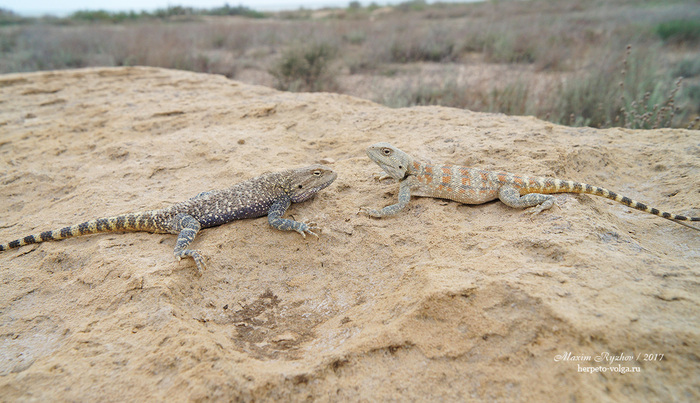 Степная агама (Trapelus sanguinolentus). На мой скромный взгляд, одна из самых красивых агам на территории бывшего СССР. А также одна из самых крупных ящериц (если не брать в расчет желтопузика) нашей фауны - длина около 30 см вместе с хвостом. Довольно обычный вид в соседнем Казахстане (во всяком случае, в Мангистауской области), а в России встречается в в Дагестане, Чечне и Ставропольском крае. Занесена в КК России (кат. 2 – вид, сокращающийся в численности и/или распространении)
