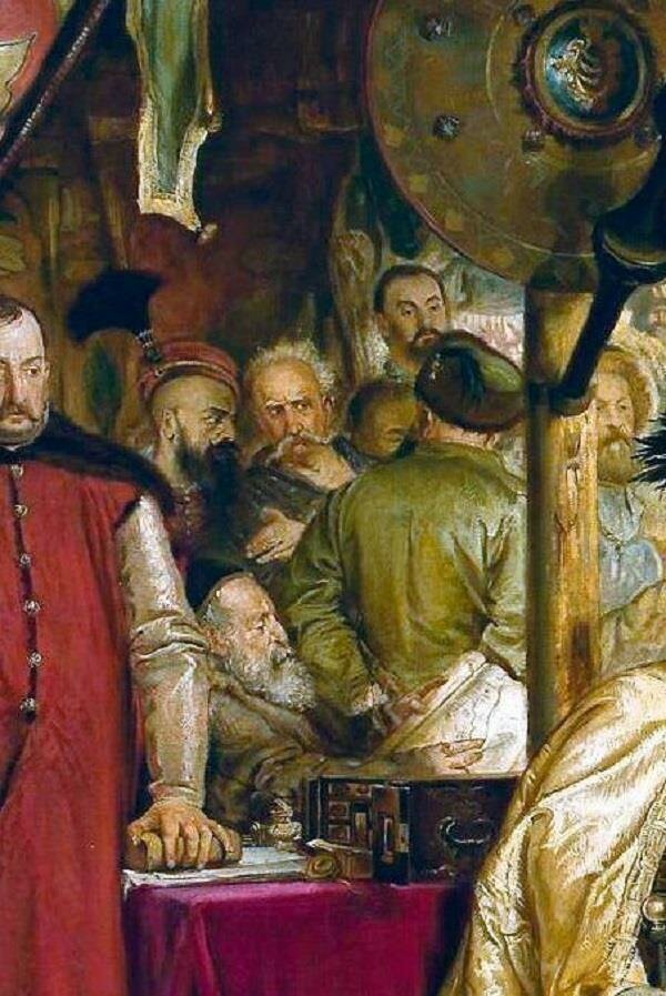 То же самое и с героями этого огромного полотна. Практически все фигуры являются историческими персонажами - и я не только про Батория, папского легата и знаменитого иезуита Поссевино, членов русской делегации или мужика в красном - канцлера Яна Замойского, однокашника Батория по университету в итальянской Падуе. Нет, даже про какого-нибудь "третьего слева в кепке во втором ряду" можно писать авантюрный роман.
