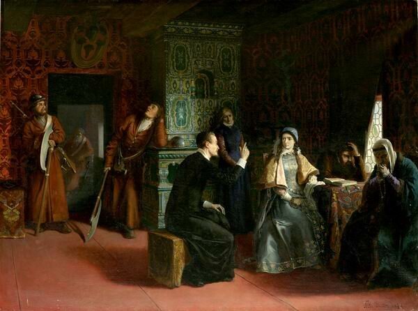 Фрагмент картины Яна Матейко «Баторий под Псковом». Слева, в черной сутане – иезуит Поссевино.