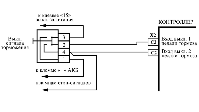 Как видите, на него приходит четыре провода. Внутри этого выключателя находятся два датчика — две пары контактов — первая пара нормально (значит в состоянии покоя) замкнута, а вторая нормально разомкнута. В момент когда вы нажимаете педаль тормоза, первая пара контактов размыкается, а вторая замыкается.