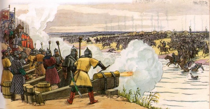 8 октября главные силы ордынцев вышли к удобному броду. Его пытались взять с наскока, но получилось у татар не очень. В этот день впервые в русской истории огнестрельное оружие было использовано в полевом бою. Переправлявшихся через Угру татар расстреливали из тюфяков и пищалей. Татары осыпали московитов стрелами из луков, а тем им довольно бодро отвечали тем же. На стороне великого князя выступало пешее ополчение, однако основной костяк у армии был также конный. Более того, длительное сосуществование с Ордой сделало свое дело – легкая кавалерия Московского княжества могла позволить себе стрелять на скаку и устраивать длительные рейды против врагов не хуже татар. Всего к Угре стеклось около 50 тысяч человек с обеих сторон. Хотя тут всегда можно делать отклонения в меньшую сторону.