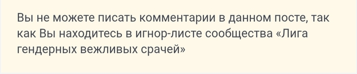 Скорее всего я нарушил какое-то правило касательно токсичности, что едва ли для меня сюрприз, а в контексте контента, который обычно поставляет ЛГВС, вообще звучит как начало неплохого анекдота. Ну или, возможно - только возможно - кто-то честность не оценил и обиделся как маленькая девочка, что опять же в контексте данного сообщества вообще ни разу не удивляет)