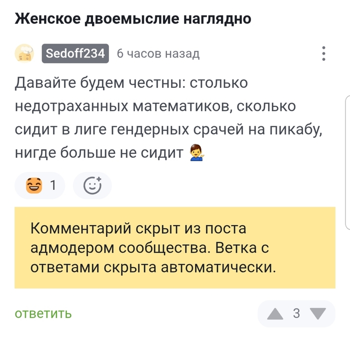 Вот уже почти 5 лет я существую на Пикабу, существую в роли сугубо контентного паразита, ничего не привносящего и ничего не обходящего стороной, этакого жука-навозника, копающегося в этом "горячем" контенте и перекатывающего туда-сюда свои шарики со всякими гадкими и не очень мыслями, смешными и не очень шутками, умными и не очень идеями. Никогда бы не подумал, что первым меня забанит сообщество, посвященное выяснению чьего пола место возле пара на кухне и почему. Можно предвидеть всё, кроме глубины своего падения 💁♂️
