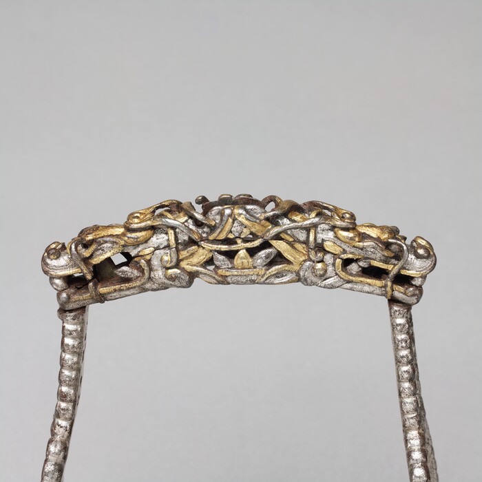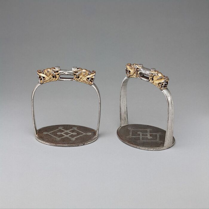 Пара стремян, возможно, 12-14 век, Тибет или Монголия. Материал: железо, золото, серебро. Высота 16,5 см.