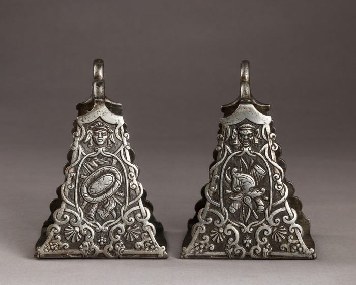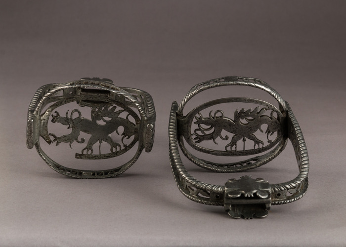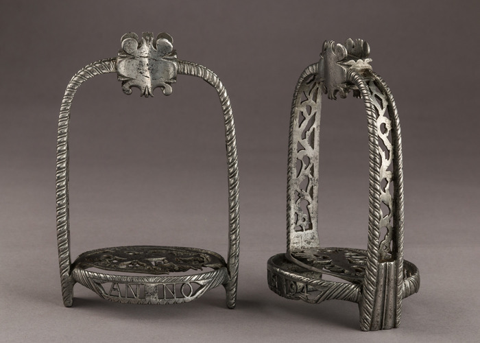 На одной стороне подножек на латыни указано имя их первоначального владельца Якоба Хелта, а также год их изготовления 1694. Геральдические грифоны - распространенный декоративный мотив на немецкой амуниции для верховой езды с 16 века, украшают верхнюю часть подножек.