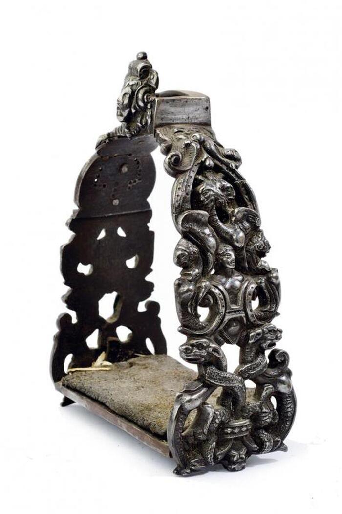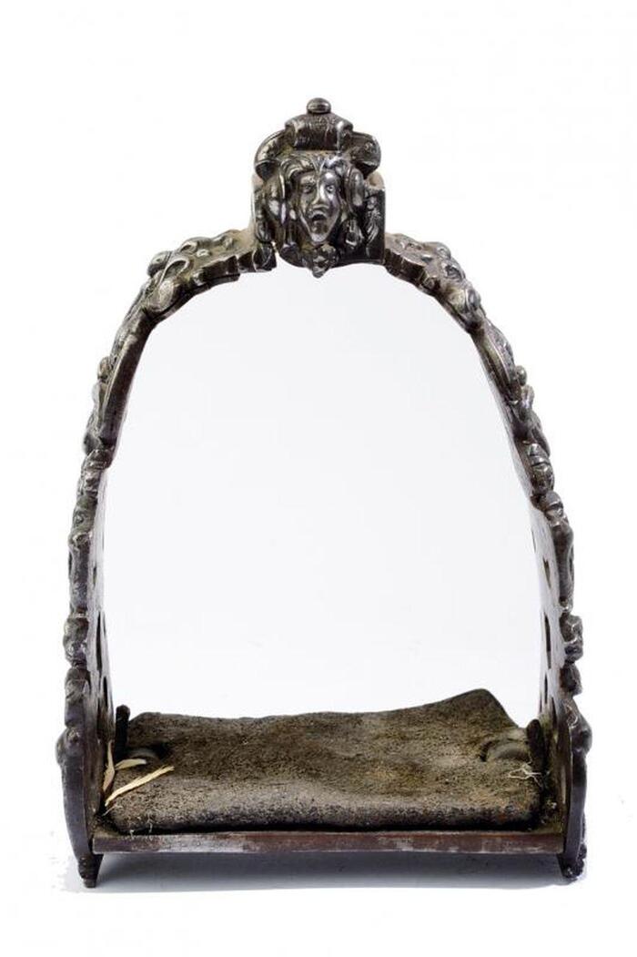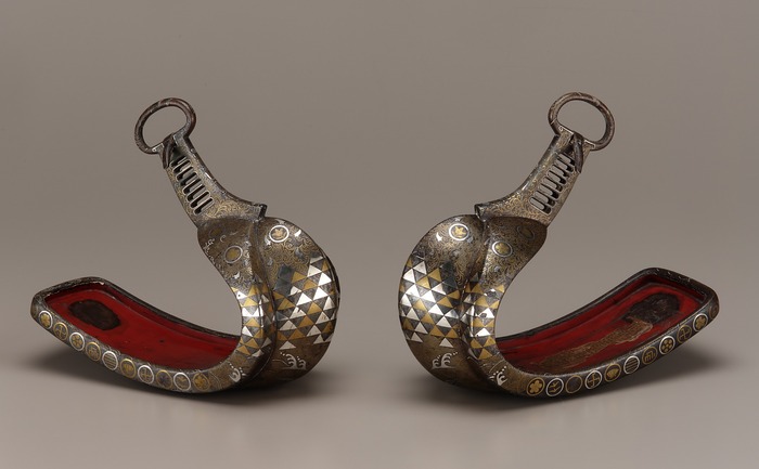 Эти стремена, украшенные оружейными трофеями, гротескными масками и арабесками, имитируют стремена османского типа. Первоначально они были полностью позолочены.