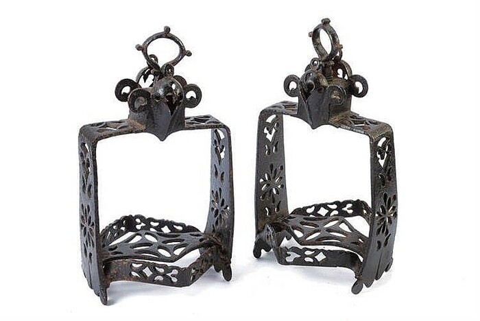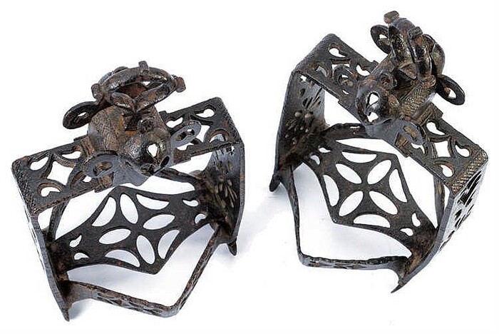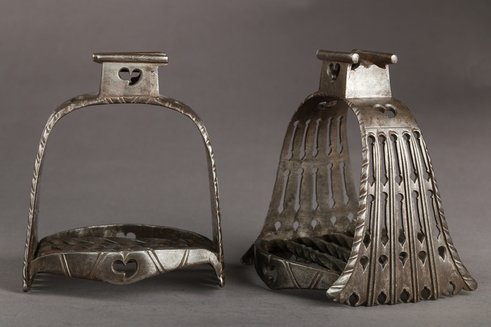 Пара стремян, конец 16 века–начало 17 века, Испания. Материал: сплав железа. Вес каждого 623,69 г. Стремена типа Genette, или jineta, типичны для исламского мира. Они были завезены в Европу во время арабского присутствия в Испании, а затем использовались испанской легкой кавалерией.