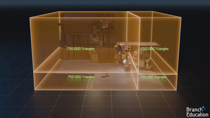 Коробки делятся надвое до тех пор, пока в каждой из них не останется всего несколько полигонов (обычно от 4 до 32). В нашем примере сцена состоит из трех миллионов полигонов, которые «раскладываются» в полмиллиона небольших коробочек.