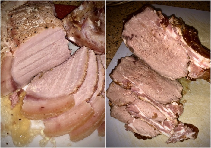 Переходим к термообработке, не зря пост называется: ветчина быстрого приготовления. В этом рецепте не нужно ждать осадку и отепление, сразу отправляем в духовой шкаф на 40°С, лучше с паром (кипяток в поддон на дно духовки), на 1 час. Далее обсушка 30 минут, конвекция на 60° (это не обязательно, если ваша духовка не имеет режима конвекции, можно смело пропустить этот этап). После обсушки я упаковал ветчину в вакуумный пакет, и поставил на варку в су-вид на 70°С. Так как был уже поздний вечер, выставил таймер на 6 часов и пошёл спать. Утром вынул ветчину из вакуумной оболочки, обсушил и дал остыть до комнатной температуры, и убрал в холодильник. После остывания провел дегустацию