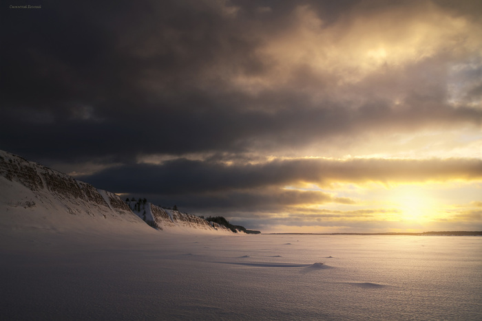 Сделали завтрак - овсянка с сухофруктами и сгущёнкой. Опасения что готовить придётся под тентом в дождь не подтвердились, тепло, светит солнце, полезли искупаться и по каякам. Но длилось тепло не долго, сегодня по прогнозу самый холодный день нашего путешествия. Через пару часов облачились в ветровки. Небольшой встречный ветер почти нивелировал скорость течения, река тут сильно разливается. То тут, то там нам встречаются мёртвые деревни, столетие деревянные дома смотрят пустыми резными окнами. За день видели пару рыбаков и одну моторку, людей тут почти не бывает. К вечеру погода начала выравниваться. Мы добрались до п. Опоки, уже на подходе и без того высокие ответные берега перешли в обрывы, перед одним из них нам предстояло заночевать.