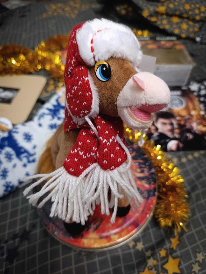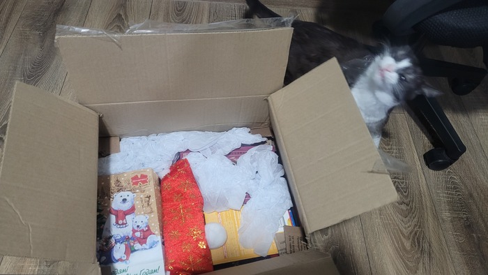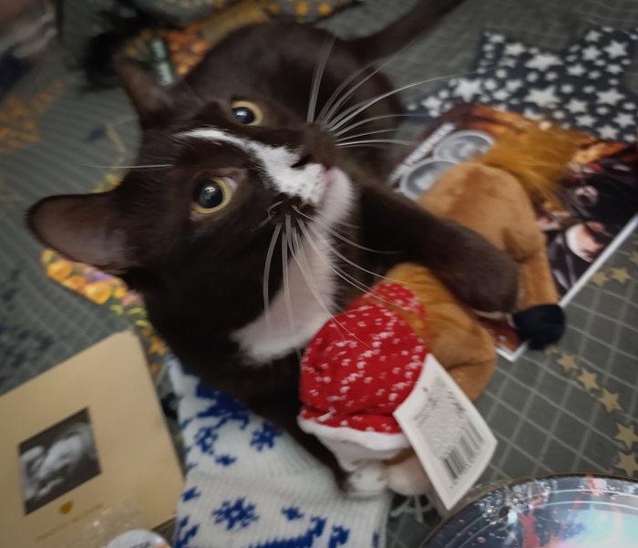 За теплые носочки и игрушечную лошадь пришлось побороться с котом. Для котов кстати тоже есть презент, даже два. Но кто-то решил, что весь подарок ему. Кусь достался даже жестяной банке с печеньем.