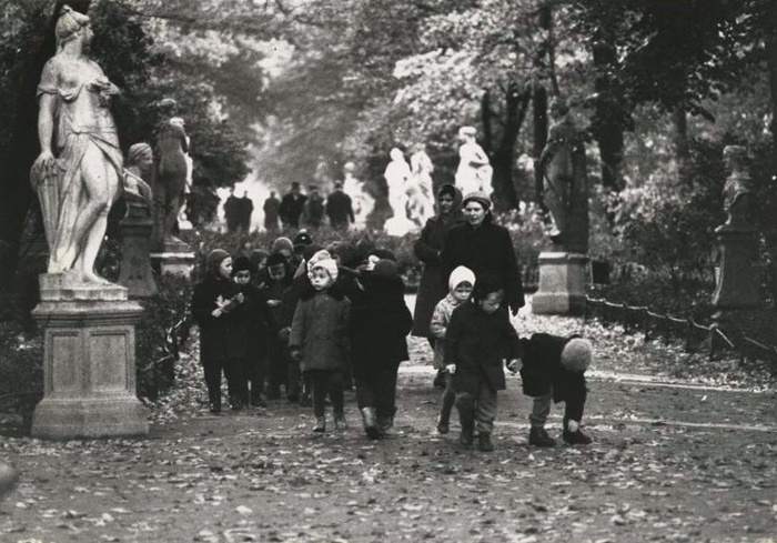 На территории дворцово-паркового музея-заповедника "Павловск" после ухода немецких войск. Ленинградская область. Дата съемки: 1944 год