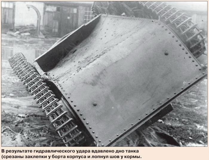 Что же касается результатов, то они были неудачными, так как все три варианта предложенных амортизирующих приспособлений для предохранения днища танка от повреждений при ударе о воду не обеспечили сохранности бронированной машины. В первом случае под днищем Т-37А смонтировали киль, изготовленный из досок и обитый листовым железом. Хотя сброс прошел в штатном режиме и танк не затонул, его днище прогнулось, и были сорваны отдельные заклепки.