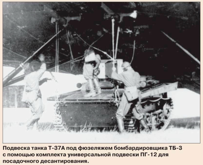 В 1935 году в войска поступила универсальна подвеска ПГ-12. С её помощью стало возможно транспортировать на штатных бомбодержателях бомбардировщика ТБ-3 артиллерийские орудия разных калибров, бронеавтомобили и плавающие танки Т-37А, принятые на вооружение ВДВ. Но для безаварийной посадки требовались подготовленные площадки, которые трудно было найти при проведении десантных операций в тылу противника.