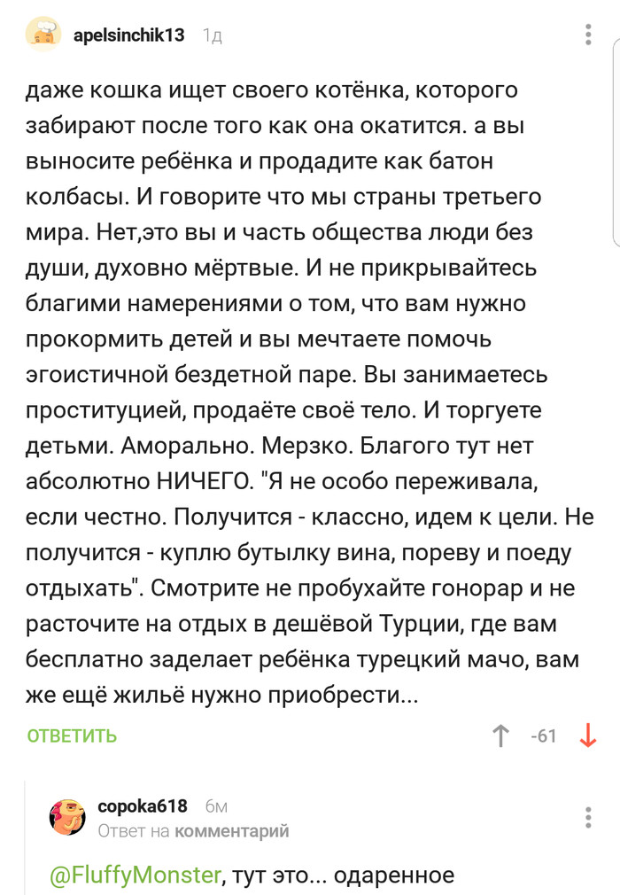 Те, кто умеет в логику, адекватность и разумные доводы, пытались напомнить и о сданных в детдом ненужных детях, и о несовершенной, увы, контрацепции, и о подпольных абортах, приводящих к повышению уровня смертности среди женщин, но..