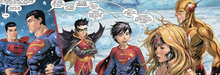 К слову, у Super Sons of Tomorrow очень бодрое начало — Тим Дрейк в одиночку побеждает Бэтмена и Супермена из прошлого. Причем Кларк — оппонент не его уровня. Тиму помогает хитрость и смекалка — он использует ресурсы параноика Брюса Уэйна, на всякий случай предусмотревшего средства для нейтрализации Кларка Кента.