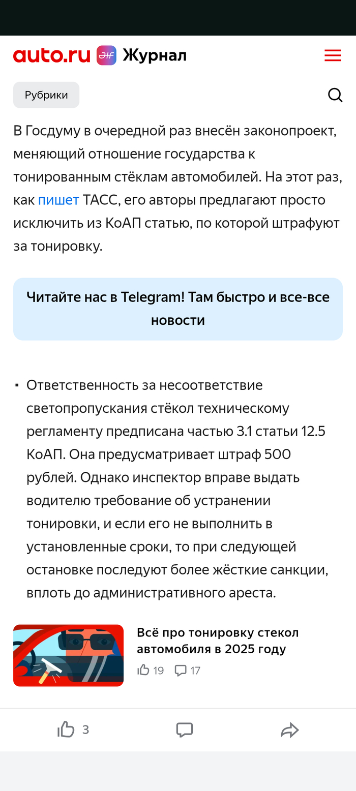 "Установка тонированных стекол на транспортное средство - это международная практика, - говорится в пояснительной записке, - поскольку тонировка позволяет сделать автомобиль не только комфортным, но и безопасным" https://rg.ru/2025/08/07/v-gosdume-predlozhili-otmenit-shtra...