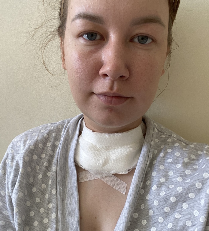 После выписки я живу спокойной жизнью в течение 3 дней. Казалось бы, восстанавливайся себе на здоровье, но нет - меня начал смущать шрам от трахеостомы: он был стянут, некрасив, очень зудел и напоминал куриную задницу, уж пардон. Стоя возле зеркала и разглядывая его, я заподозрила что-то неладное: