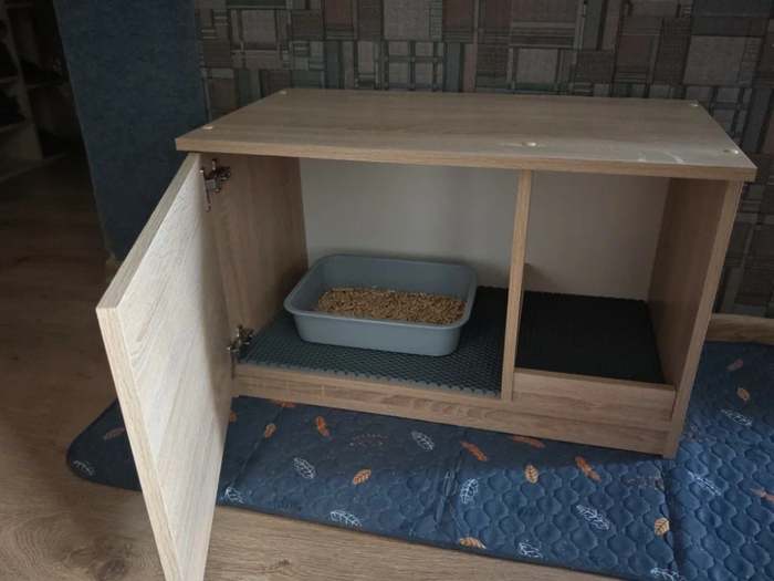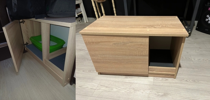 Собираем туалет-домик-тумбу из качественного и экологически чистого материала (ЛДСП), с подложкой из коврика Ева под кошачий лоток, который отличается прочностью и долговечностью. Элегантная и стильная тумбочка впишется в любой интерьер, можно поставить в коридоре, в комнате и на кухне. Высокие борта туалета для кошки с крепкой фурнитурой и долгим сроком службы, подходят как для маленьких, так и для средних пород домашних животных. Вы можете установить внутрь данной модели лотки размером до 41 х 30см, в том числе и с решёткой (лоток в комплект не входит). Закрывающий дом избавит Вашу квартиру от запаха и мусора, так как питомец не разбросает наполнитель. Легко убирать: достаточно открыть дверь и вытащить лоточек. Кроме того, тумбочка послужит отличным уединением для Вашего любимца, она может использоваться как кошачья лежанка (лежак) - уютное, укромное место для отдыха и сна. А на поверхности тумбы можно разместить средства по уходу за питомцами, вещи для прогулок. Очень удобно когда все лежит в одном месте и под рукой! Ссылка на такую тумбочку