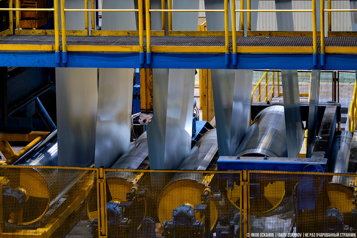 На фото ниже я стою примерно посередине, за моей спиной ещё такое же расстояние. Это огромный, непрерывно действующий сложный "организм", а не два здоровенных вала, сплющивающие металл в лист. Технология производства листа значительно усложнилась в XXI веке, по сравнению с XIX. И мои представления безнадёжно устарели.
