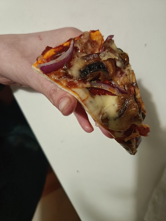За несколько минут до готовности грею лепешки. Тут важно, что бы они были теплыми, в идеале чуть с корочкой, но при этом сохраняли достаточную мягкость, чтобы сложиться и не сломаться. В этот раз момент упустил, лепешки не складывались, но мне от этого хуже не было.