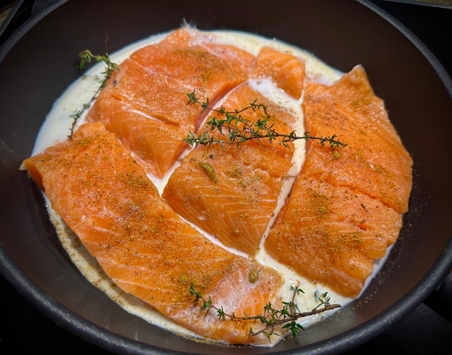 И залил я молоком. До уровня - середина ломтя. Можно и сливками залить было. Но лосось рыба и без того весьма жирная. И молока ему хватит.