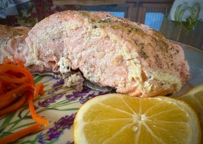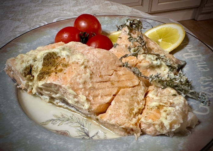 Рыба получилась очень сочная. Вопреки опасениям ничуть не жирная. Сочетание такое … молочной сливочности и рыбьего, но благородного вкуса лосося…