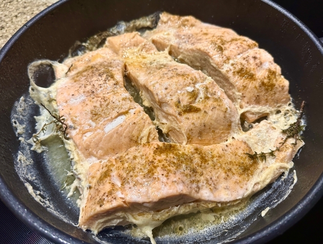 Лосось был в виде филейного пласта на коже. Нарезал я его на ломти порционные. Выложил на толстостенную, вернее толстодонную, чугунную сковороду. Вниз кожей, что примечательно.