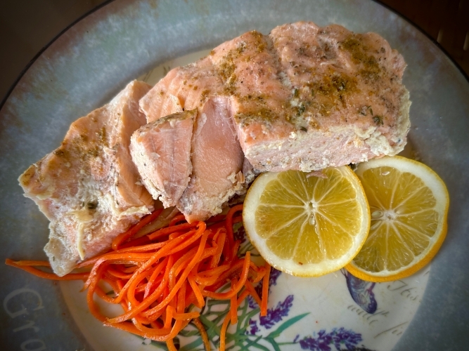 Вот такой лосось получился. Не знаю уж точно какая рыба была в пакете, вакуумном таком, но на сопроводительной этикетке значилось «лосось». Кто я такой, чтобы не верить официальной этикетке? Причем рыбу приобрели не в придорожной забегаловке, а вполне себе в большом и красивом мегамаркете.