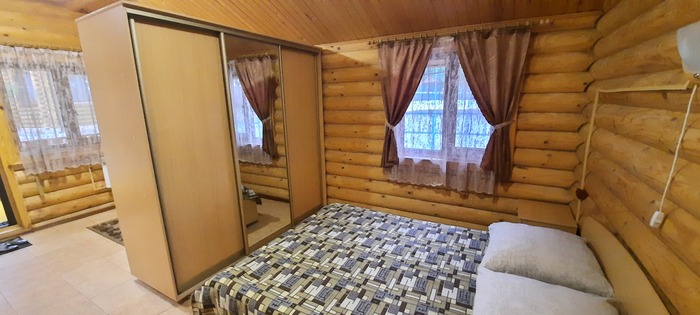 Наш домик на базе отдыха N 16. Цена в таком домике 5500 рублей за сутки без питания. В нем могут разместиться до 4 человек. Одна, но большая комната. Двуспальная кровать отгорожена шкафом. Есть раскладной диван. Туалетная комната с душем. Всё необходимое присутствует: есть ТВ, холодильник, микроволновка, плита, кастрюлька и сковородка, набор посуды на 4 персоны.