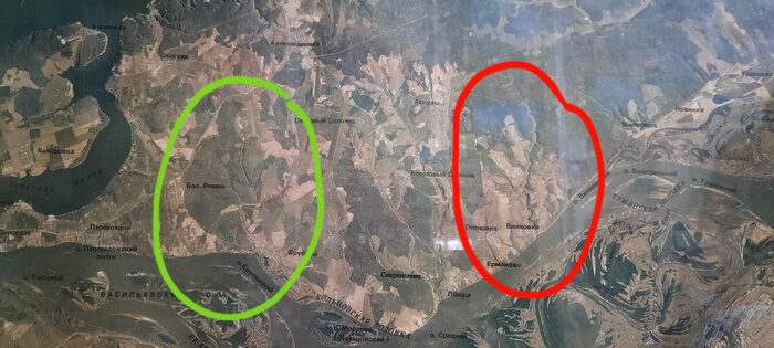 На этом музейном экспонате снимок из космоса Самарской области. При богатой фантазии можно увидеть хозяйку Самарской Луки, что сидит на Волге в платье с оборками (красный цвет) и разговаривает она с монахов (зеленый). Снимок без фотошопа👍